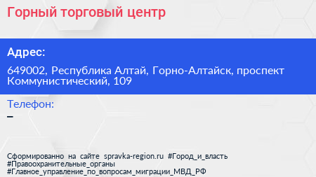 Горный, торговый центр по адресу 649002, Республика Алтай, Горно-Алтайск, проспект Коммунистический, 109 в дальнейшем Организация, размещена в следующих категориях: