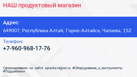 НАШ, продуктовый магазин по адресу 649007, Республика Алтай, Горно-Алтайск, Чапаева, 152 в дальнейшем Организация, размещена в следующих категориях: