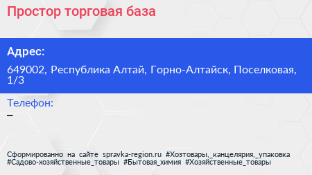 Простор, торговая база по адресу 649002, Республика Алтай, Горно-Алтайск, Поселковая, 1/3 в дальнейшем Организация, размещена в следующих категориях: