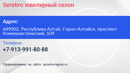 Serebro, ювелирный салон по адресу 649002, Республика Алтай, Горно-Алтайск, проспект Коммунистический, 109 в дальнейшем Организация, размещена в следующих категориях: