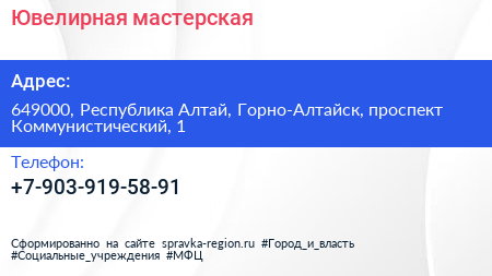 Ювелирная мастерская по адресу 649000, Республика Алтай, Горно-Алтайск, проспект Коммунистический, 1 в дальнейшем Организация, размещена в следующих категориях:
