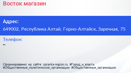 Восток, магазин по адресу 649002, Республика Алтай, Горно-Алтайск, Заречная, 75 в дальнейшем Организация, размещена в следующих категориях: