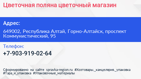 Цветочная поляна, цветочный магазин по адресу 649002, Республика Алтай, Горно-Алтайск, проспект Коммунистический, 95 в дальнейшем Организация, размещена в следующих категориях: