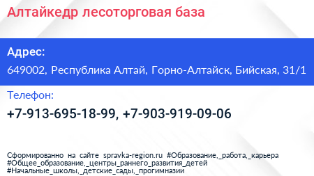 Алтайкедр, лесоторговая база по адресу 649002, Республика Алтай, Горно-Алтайск, Бийская, 31/1 в дальнейшем Организация, размещена в следующих категориях: