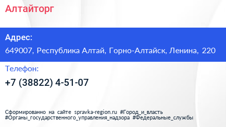 Алтайторг по адресу 649007, Республика Алтай, Горно-Алтайск, Ленина, 220 в дальнейшем Организация, размещена в следующих категориях: