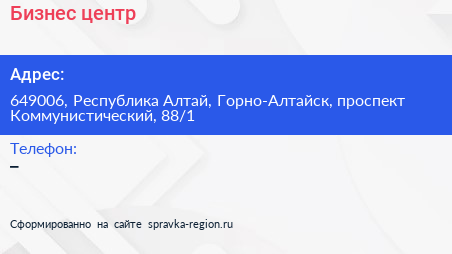 Бизнес-центр по адресу 649006, Республика Алтай, Горно-Алтайск, проспект Коммунистический, 88/1 в дальнейшем Организация, размещена в следующих категориях: