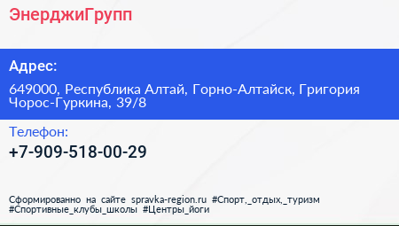 ЭнерджиГрупп по адресу 649000, Республика Алтай, Горно-Алтайск, Григория Чорос-Гуркина, 39/8 в дальнейшем Организация, размещена в следующих категориях: