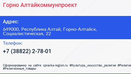 Горно-Алтайкоммунпроект по адресу 649000, Республика Алтай, Горно-Алтайск, Социалистическая, 22 в дальнейшем Организация, размещена в следующих категориях: