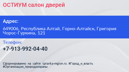 ОСТИУМ, салон дверей по адресу 649006, Республика Алтай, Горно-Алтайск, Григория Чорос-Гуркина, 121 в дальнейшем Организация, размещена в следующих категориях: