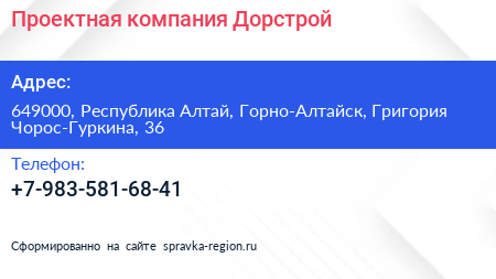 Проектная компания Дорстрой по адресу 649000, Республика Алтай, Горно-Алтайск, Григория Чорос-Гуркина, 36 в дальнейшем Организация, размещена в следующих категориях: