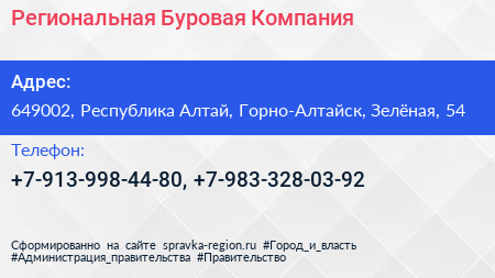 Региональная Буровая Компания по адресу 649002, Республика Алтай, Горно-Алтайск, Зелёная, 54 в дальнейшем Организация, размещена в следующих категориях: