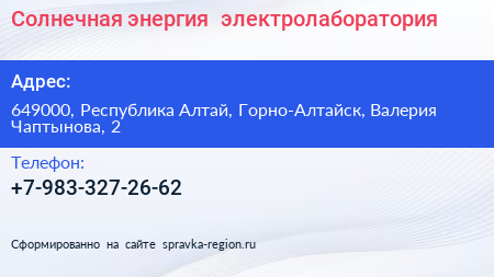 Солнечная энергия+, электролаборатория по адресу 649000, Республика Алтай, Горно-Алтайск, Валерия Чаптынова, 2 в дальнейшем Организация, размещена в следующих категориях: