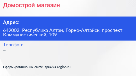 Домострой, магазин по адресу 649002, Республика Алтай, Горно-Алтайск, проспект Коммунистический, 109 в дальнейшем Организация, размещена в следующих категориях:
