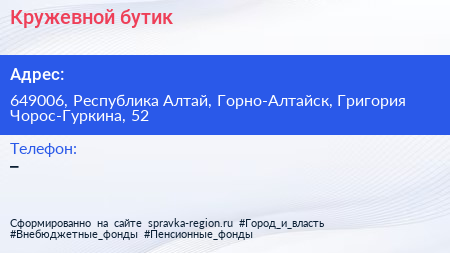 Кружевной бутик по адресу 649006, Республика Алтай, Горно-Алтайск, Григория Чорос-Гуркина, 52 в дальнейшем Организация, размещена в следующих категориях:
