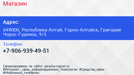 Магазин по адресу 649000, Республика Алтай, Горно-Алтайск, Григория Чорос-Гуркина, 9/1 в дальнейшем Организация, размещена в следующих категориях: