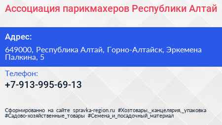 Ассоциация парикмахеров Республики Алтай по адресу 649000, Республика Алтай, Горно-Алтайск, Эркемена Палкина, 5 в дальнейшем Организация, размещена в следующих категориях: