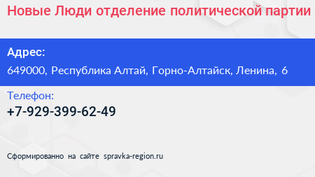 Новые Люди, отделение политической партии по адресу 649000, Республика Алтай, Горно-Алтайск, Ленина, 6 в дальнейшем Организация, размещена в следующих категориях: