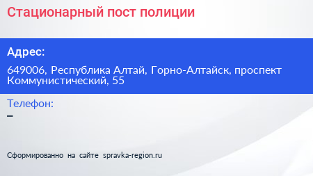 Стационарный пост полиции по адресу 649006, Республика Алтай, Горно-Алтайск, проспект Коммунистический, 55 в дальнейшем Организация, размещена в следующих категориях: