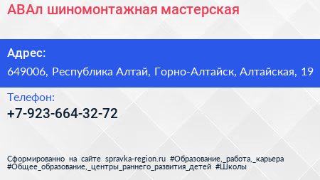 АВАл, шиномонтажная мастерская по адресу 649006, Республика Алтай, Горно-Алтайск, Алтайская, 19 в дальнейшем Организация, размещена в следующих категориях: