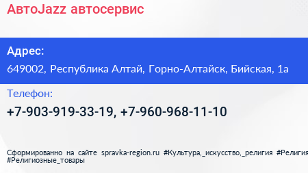 АвтоJazz, автосервис по адресу 649002, Республика Алтай, Горно-Алтайск, Бийская, 1а в дальнейшем Организация, размещена в следующих категориях: