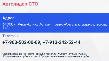 Автолидер, СТО по адресу 649007, Республика Алтай, Горно-Алтайск, Барнаульская, 1/3 в дальнейшем Организация, размещена в следующих категориях:
