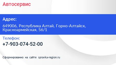Автосервис по адресу 649006, Республика Алтай, Горно-Алтайск, Красноармейская, 56/1 в дальнейшем Организация, размещена в следующих категориях: