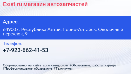 Exist.ru, магазин автозапчастей по адресу 649007, Республика Алтай, Горно-Алтайск, Околичный переулок, 9 в дальнейшем Организация, размещена в следующих категориях: