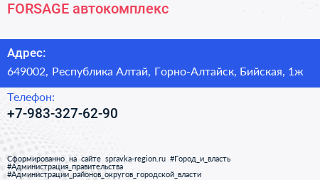 FORSAGE, автокомплекс по адресу 649002, Республика Алтай, Горно-Алтайск, Бийская, 1ж в дальнейшем Организация, размещена в следующих категориях: