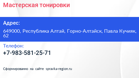 Мастерская тонировки по адресу 649000, Республика Алтай, Горно-Алтайск, Павла Кучияк, 62 в дальнейшем Организация, размещена в следующих категориях:
