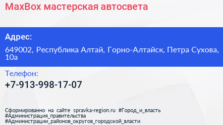 MaxBox, мастерская автосвета по адресу 649002, Республика Алтай, Горно-Алтайск, Петра Сухова, 10а в дальнейшем Организация, размещена в следующих категориях: