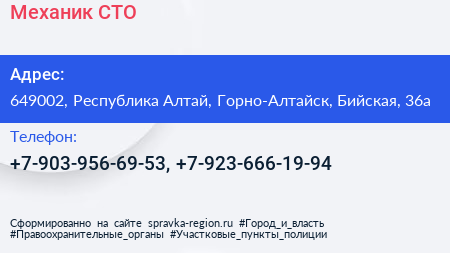 Механик, СТО по адресу 649002, Республика Алтай, Горно-Алтайск, Бийская, 36а в дальнейшем Организация, размещена в следующих категориях: