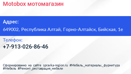 Motobox, мотомагазин по адресу 649002, Республика Алтай, Горно-Алтайск, Бийская, 1е в дальнейшем Организация, размещена в следующих категориях: