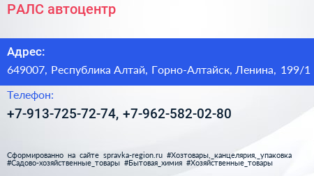 РАЛС, автоцентр по адресу 649007, Республика Алтай, Горно-Алтайск, Ленина, 199/1 в дальнейшем Организация, размещена в следующих категориях: