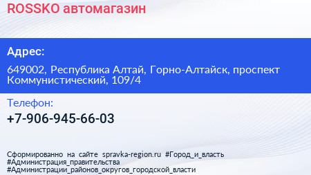 ROSSKO, автомагазин по адресу 649002, Республика Алтай, Горно-Алтайск, проспект Коммунистический, 109/4 в дальнейшем Организация, размещена в следующих категориях: