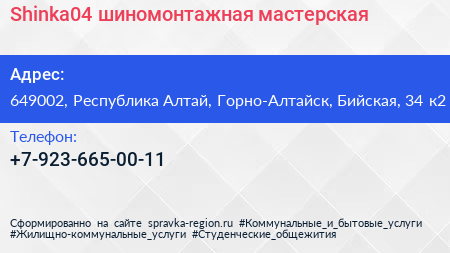 Shinka04, шиномонтажная мастерская по адресу 649002, Республика Алтай, Горно-Алтайск, Бийская, 34 к2 в дальнейшем Организация, размещена в следующих категориях:
