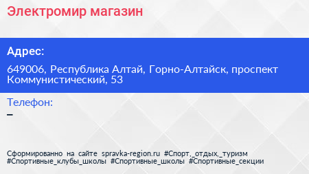 Электромир, магазин по адресу 649006, Республика Алтай, Горно-Алтайск, проспект Коммунистический, 53 в дальнейшем Организация, размещена в следующих категориях: