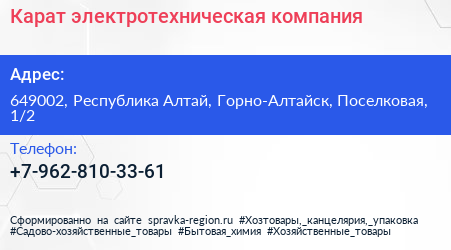 Карат, электротехническая компания по адресу 649002, Республика Алтай, Горно-Алтайск, Поселковая, 1/2 в дальнейшем Организация, размещена в следующих категориях: