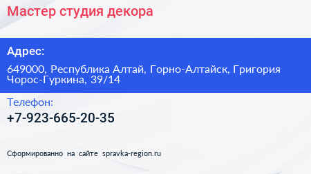 Мастер, студия декора по адресу 649000, Республика Алтай, Горно-Алтайск, Григория Чорос-Гуркина, 39/14 в дальнейшем Организация, размещена в следующих категориях: