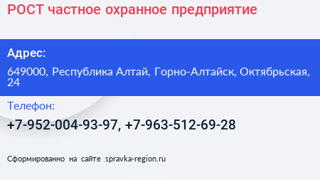 РОСТ, частное охранное предприятие по адресу 649000, Республика Алтай, Горно-Алтайск, Октябрьская, 24 в дальнейшем Организация, размещена в следующих категориях: