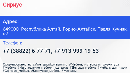 Сириус по адресу 649000, Республика Алтай, Горно-Алтайск, Павла Кучияк, 62 в дальнейшем Организация, размещена в следующих категориях: