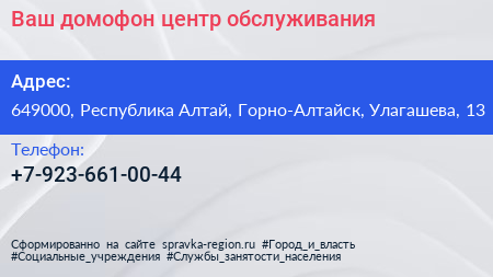 Ваш домофон, центр обслуживания по адресу 649000, Республика Алтай, Горно-Алтайск, Улагашева, 13 в дальнейшем Организация, размещена в следующих категориях: