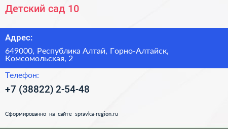 Детский сад №10 по адресу 649000, Республика Алтай, Горно-Алтайск, Комсомольская, 2 в дальнейшем Организация, размещена в следующих категориях: