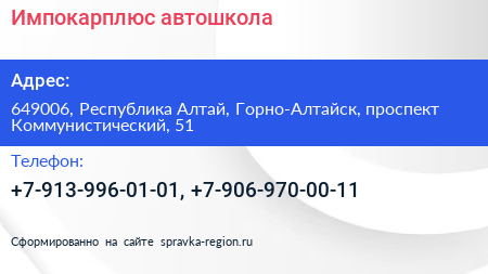 Импокарплюс, автошкола по адресу 649006, Республика Алтай, Горно-Алтайск, проспект Коммунистический, 51 в дальнейшем Организация, размещена в следующих категориях: