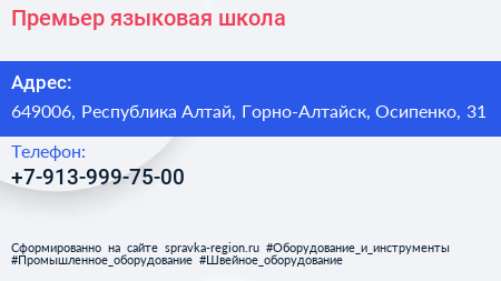 Премьер, языковая школа по адресу 649006, Республика Алтай, Горно-Алтайск, Осипенко, 31 в дальнейшем Организация, размещена в следующих категориях: