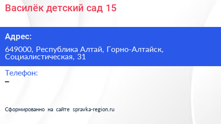 Василёк, детский сад №15 по адресу 649000, Республика Алтай, Горно-Алтайск, Социалистическая, 31 в дальнейшем Организация, размещена в следующих категориях: