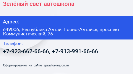 Зелёный свет, автошкола по адресу 649006, Республика Алтай, Горно-Алтайск, проспект Коммунистический, 76 в дальнейшем Организация, размещена в следующих категориях: