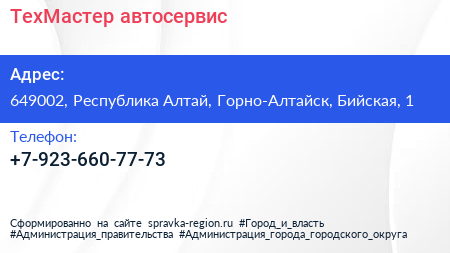 ТехМастер, автосервис по адресу 649002, Республика Алтай, Горно-Алтайск, Бийская, 1 в дальнейшем Организация, размещена в следующих категориях: