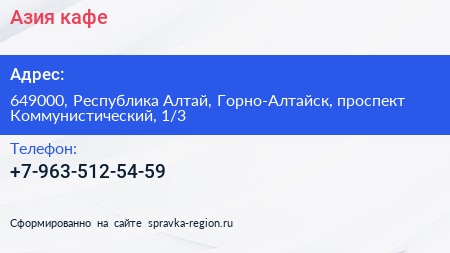 Азия, кафе по адресу 649000, Республика Алтай, Горно-Алтайск, проспект Коммунистический, 1/3 в дальнейшем Организация, размещена в следующих категориях: