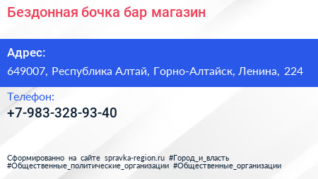Бездонная бочка, бар-магазин по адресу 649007, Республика Алтай, Горно-Алтайск, Ленина, 224 в дальнейшем Организация, размещена в следующих категориях: