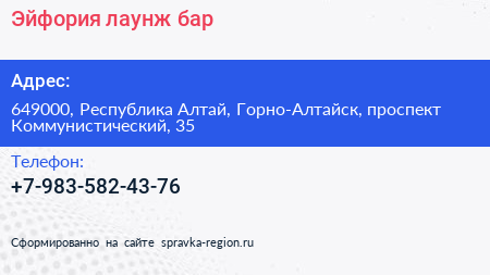 Эйфория, лаунж-бар по адресу 649000, Республика Алтай, Горно-Алтайск, проспект Коммунистический, 35 в дальнейшем Организация, размещена в следующих категориях: